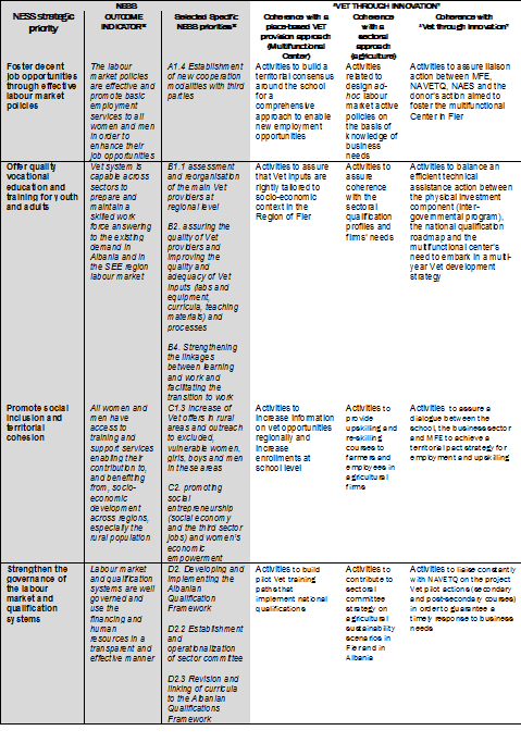 Since the project operates at local level (the Region of Fier) and with a sectoral focus (vocational education and training in agriculture) it is of paramount importance to assume an additional “coherence framework” that helps link the NESS monitoring activities with the crucial steps of the project implementation.